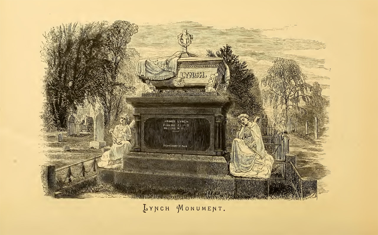 A magnificent and somewhat unique example of mortuary sculpture found at First Calvary Cemetery here in Queens is the Lynch monument. The screeds engraved on it indicate the presence of several generations of the family, and the quality of the stone work indicates that the Lynches were notable figures during their time. As mentioned in the past, however, when one is searching for information on individuals with a “common” name (particularly a common Irish surname) – things get a little hazy. There have been a lot of folks, both famous and infamous, named “James Lynch”.
