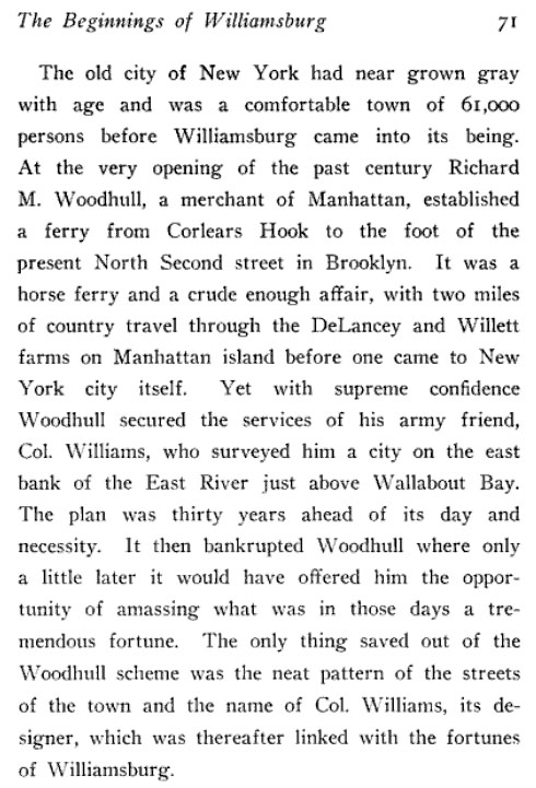 In 1638 the Dutch West India Company first purchased the area’s land from the local Native Americans. In 1661, the company chartered the Town of Boswijck, including land that would later become Williamsburg. After the English takeover of New Netherland in 1664, the town’s name was anglicized to Bushwick. During colonial times, villagers called the area “Bushwick Shore.” This name lasted for about 140 years. Bushwick Shore was cut off from the other villages in Bushwick by Bushwick Creek to the north and by Cripplebush, a region of thick, boggy shrub land which extended from Wallabout Creek to Newtown Creek, to the south and east. Bushwick residents called Bushwick Shore “the Strand.” Farmers and gardeners from the other Bushwick villages sent their goods to Bushwick Shore to be ferried across the East River to New York City for sale via a market at present day Grand Street. Bushwick Shore’s favorable location close to New York City led to the creation of several farming developments. In 1802, real estate speculator Richard M. Woodhull acquired 13 acres (53,000 m²) near what would become Metropolitan Avenue, then North 2nd Street. He had Colonel Jonathan Williams, a U.S. Engineer, survey the property, and named it Williamsburgh (with an h at the end) in his honor. Originally a 13-acre (53,000 m2) development within Bushwick Shore, Williamsburg rapidly expanded during the first half of the nineteenth century and eventually seceded from Bushwick and formed its own independent city.