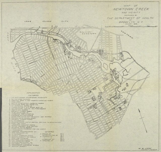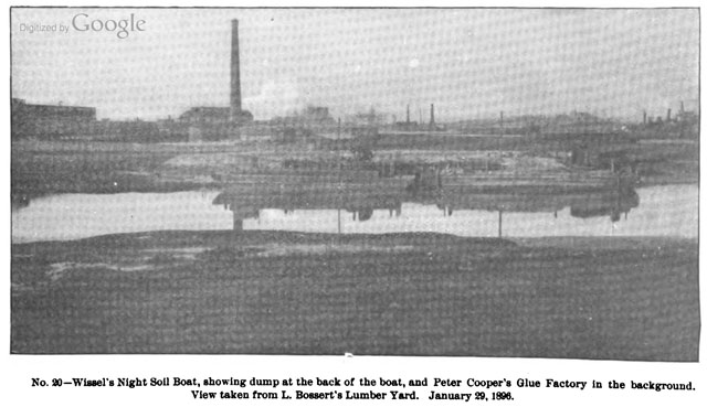 One of those little nuggets which has fascinated me since beginning to learn about the Creek has been references to “Conrad Wissel’s Dead Animal Wharf” or alternately “night soil dock”. Imagine my surprise when I found a photo of the place from 1896 the other night. In the far left corner of the frame, you can just make out the Maspeth Avenue Plank Road. Wo!