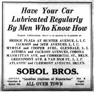 This shot, of the Sobol Brothers SOCONY station at the intersection of Greenpoint and Van Dam, is from August 20, 1930- roughly 82 years ago. SOCONY, of course, stands for Standard Oil Company of New York. Standard used to franchise out filling stations, in the same manner as its modern day incarnation ExxonMobil does. The name SOCONY indicates that the signage went up after 1911 when the Standard Trust was broken up, incidentally.