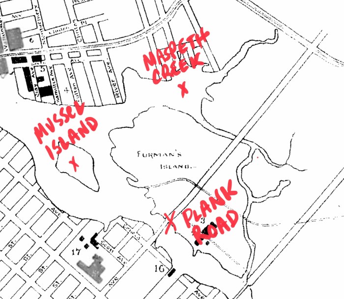 Below is a section from an undated map of smell nuisances that was likely drawn in the 1890’s depicting Mussel Island, Maspeth Creek, and Furman’s Island. As you can see, the coastline of Queens was VERY different in the relatively recent past.