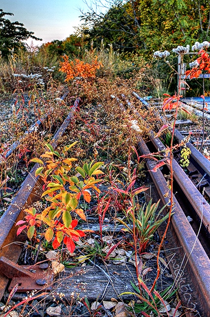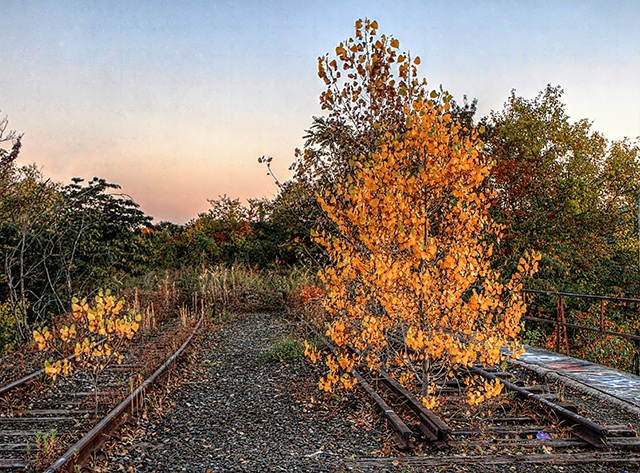 A little further walk, we arrived at the object of my photographic desire: the flora, and especially the burnished gold trees growing in between and out of the deserted rails. This was what I had come to see and capture, and in so doing, take hold of another contrast: the “dead” rails and the dying trees. The contrast of these objects, their diverse colors, the innate beauty of the multiple layers made the trip a success for me.