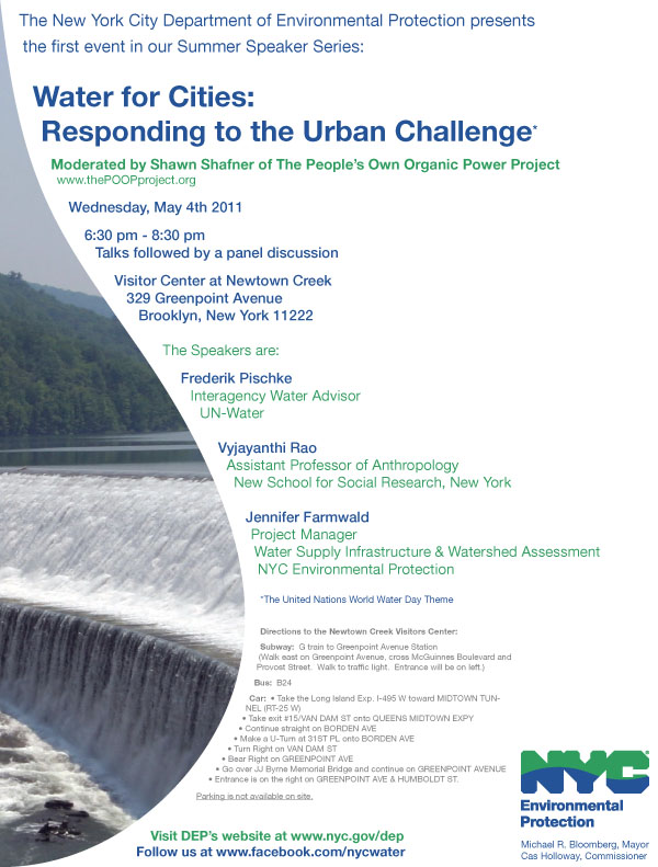 The Speakers are: Frederik Pischke Interagency Water Advisor UN-Water, Vyjayanthi Rao Assistant Professor of Anthropology New School for Social Research, New York, Jennifer Farmwald Project Manager Water Supply Infrastructure & Watershed Assessment NYC Environmental Protection.